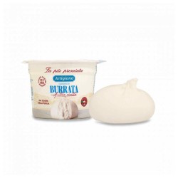 Täglich frisch von Bauernhöfen in der Murgia-Region von Bari gesammelte Kuhmilch, umhüllt von einer dünnen Schicht aus gezogenem Quark, die Stücke von gezogenem Quark und Sahne enthält.