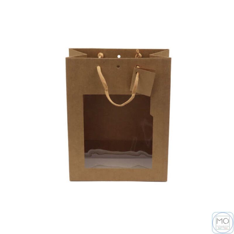 Bellissimo sacchetto regalo in kraft spesso con finestra e manici, ideale per realizzare un bel sacchetto regalo da 6 prodotti.