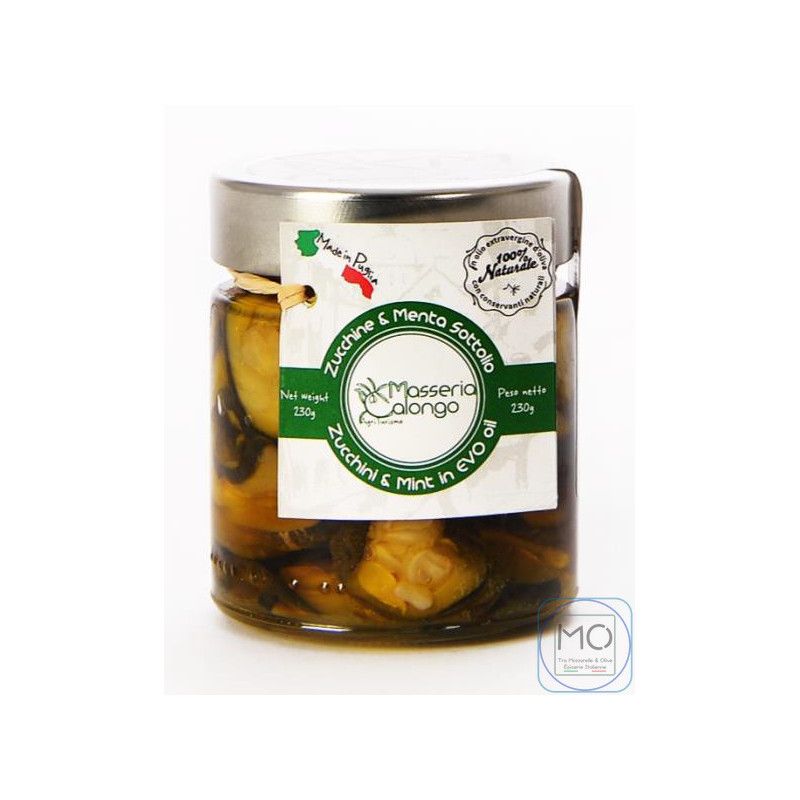 Ingredienti: Zucchine 70%, Menta 0,5%, Olio Extravergine di Oliva, vino bianco, aceto di vino bianco, peperoncino, sale, aglio. Allergeni: aglio, Potrebbe contenere solfiti.