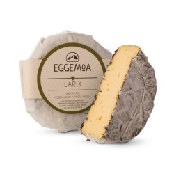 Piccolo formaggio a crosta fiorita prodotto con latte vaccino crudo e affinato con aghi di larice tostati raccolti da Michael nel bosco che circonda il maso Eggemoa